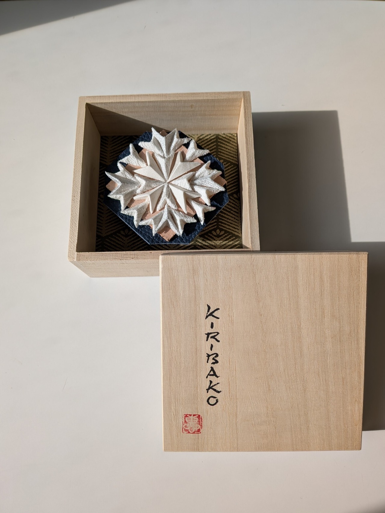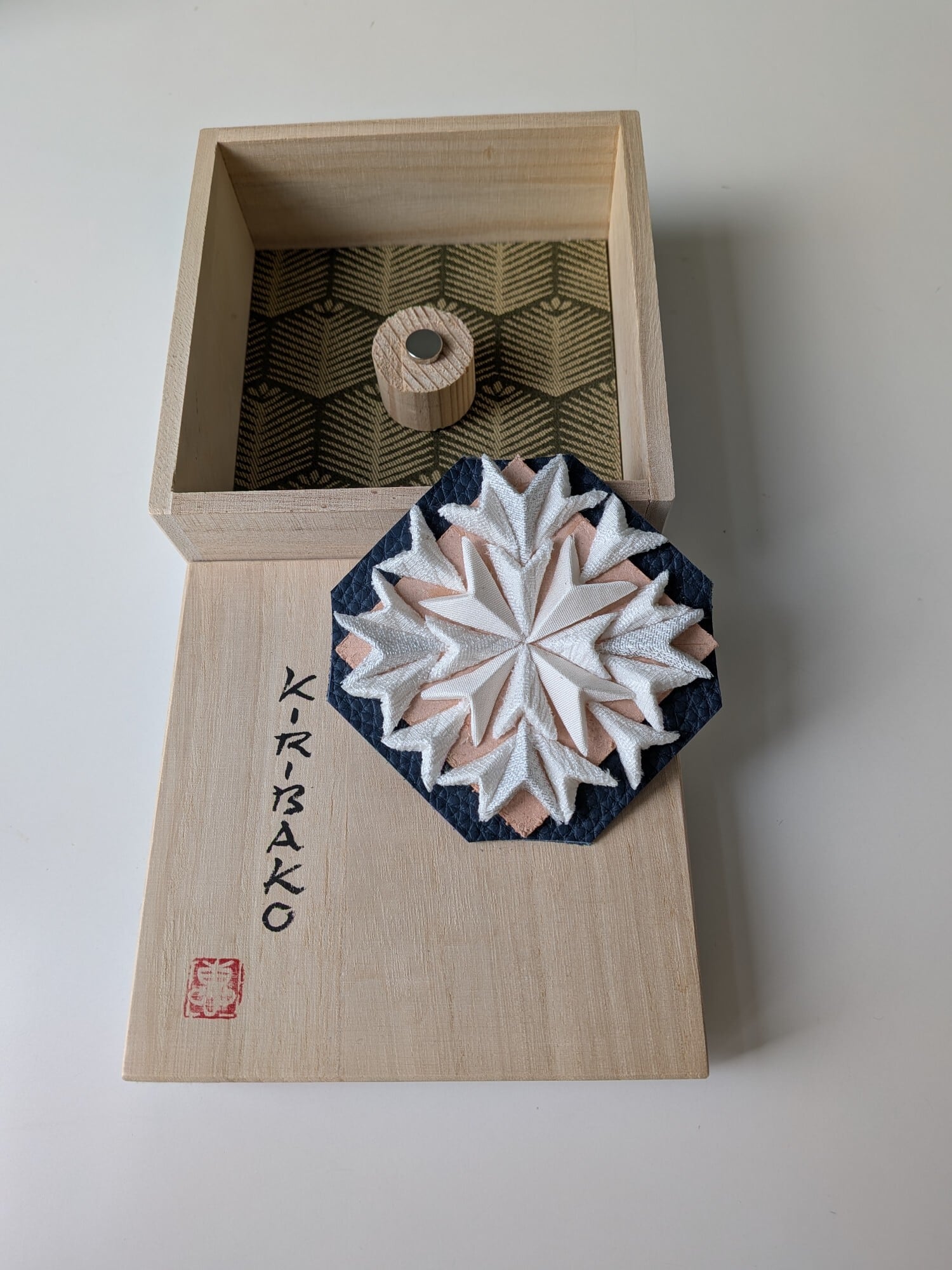 伝統技法で丹後ちりめんを使用し、桐の箱(KIRIBAKO)に入れた新しい形の壁掛け・置物。