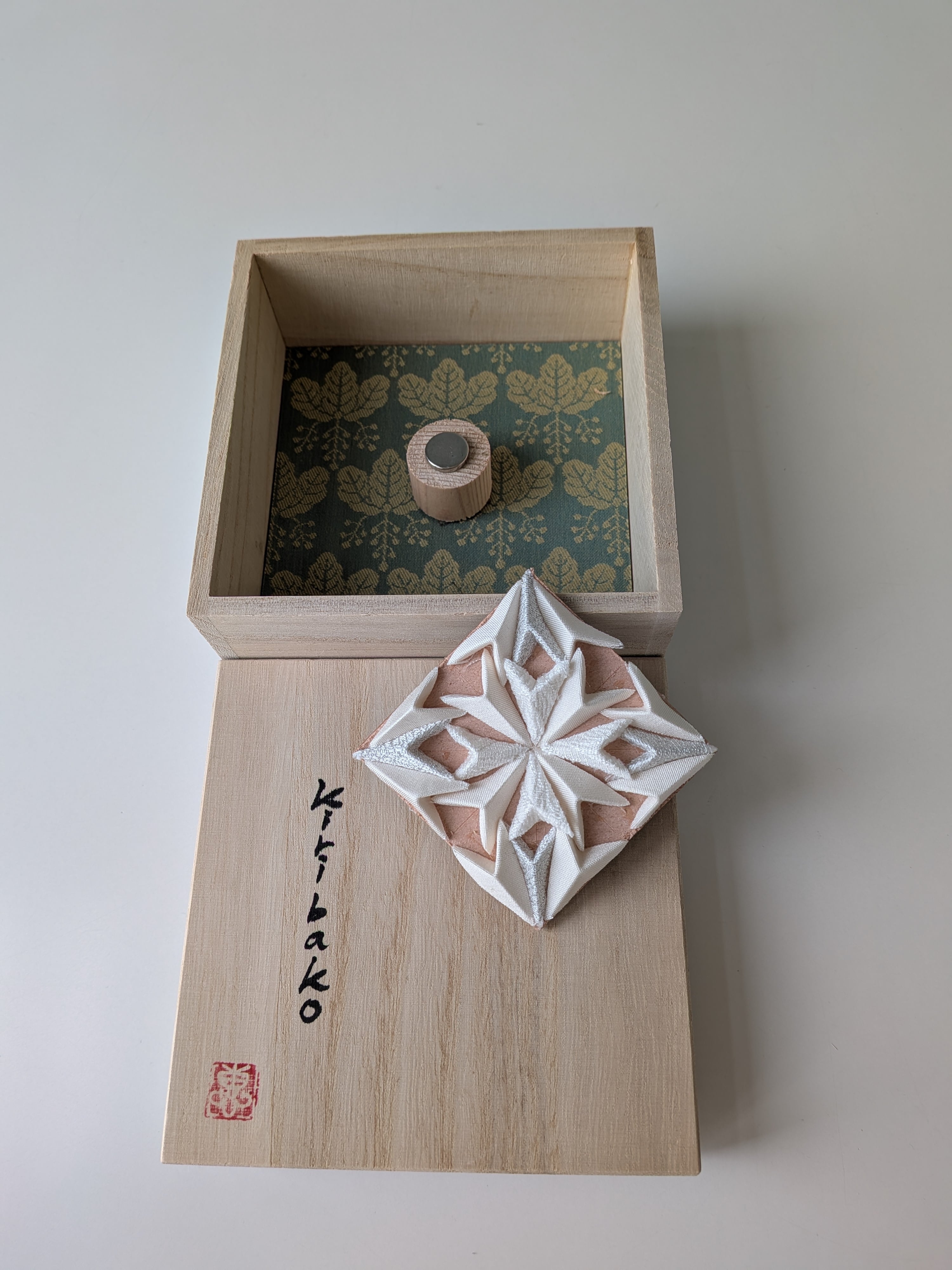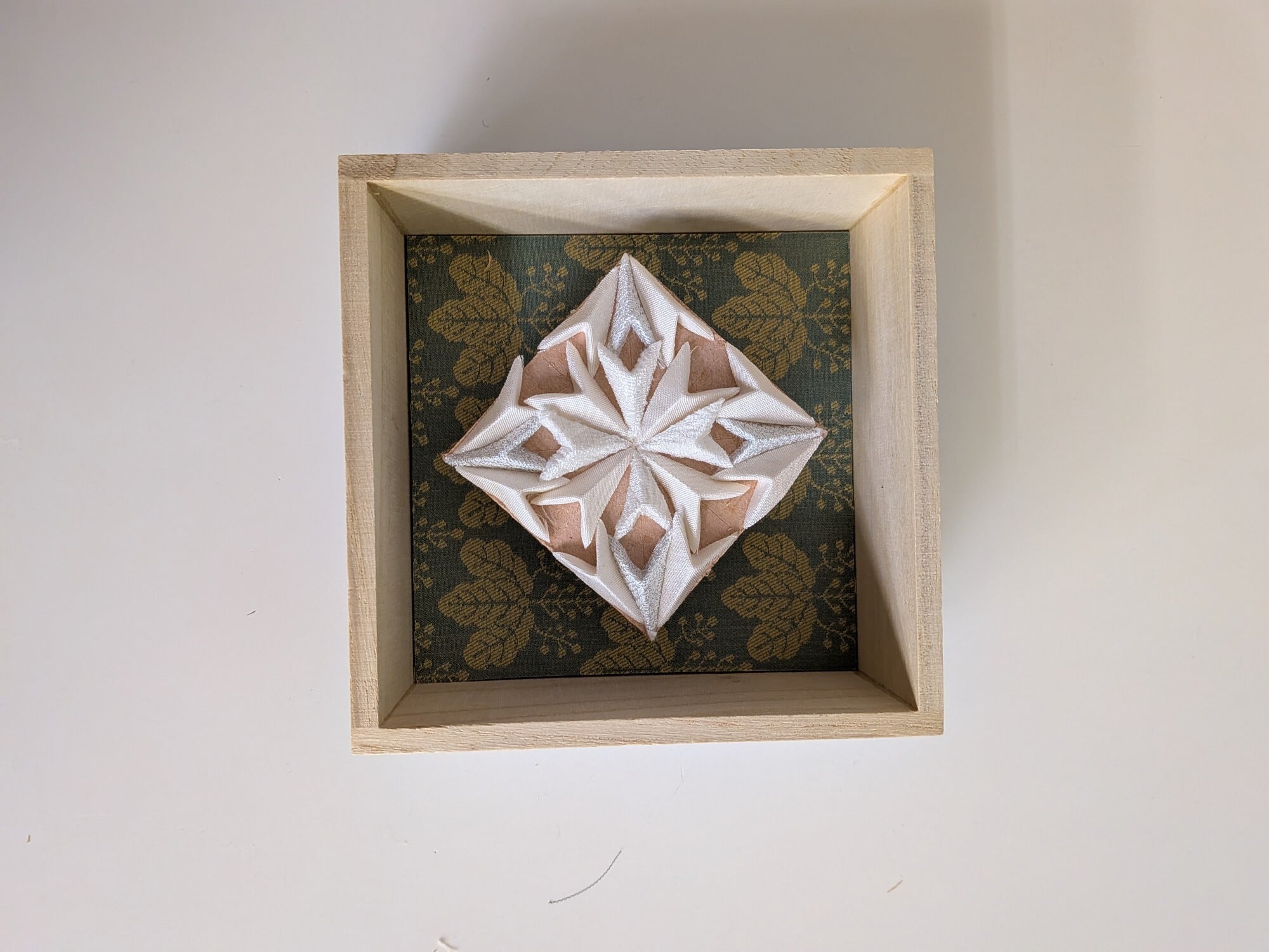 伝統技法で丹後ちりめんを使用し、桐の箱(KIRIBAKO)に入れた新しい形の壁掛け・置物。