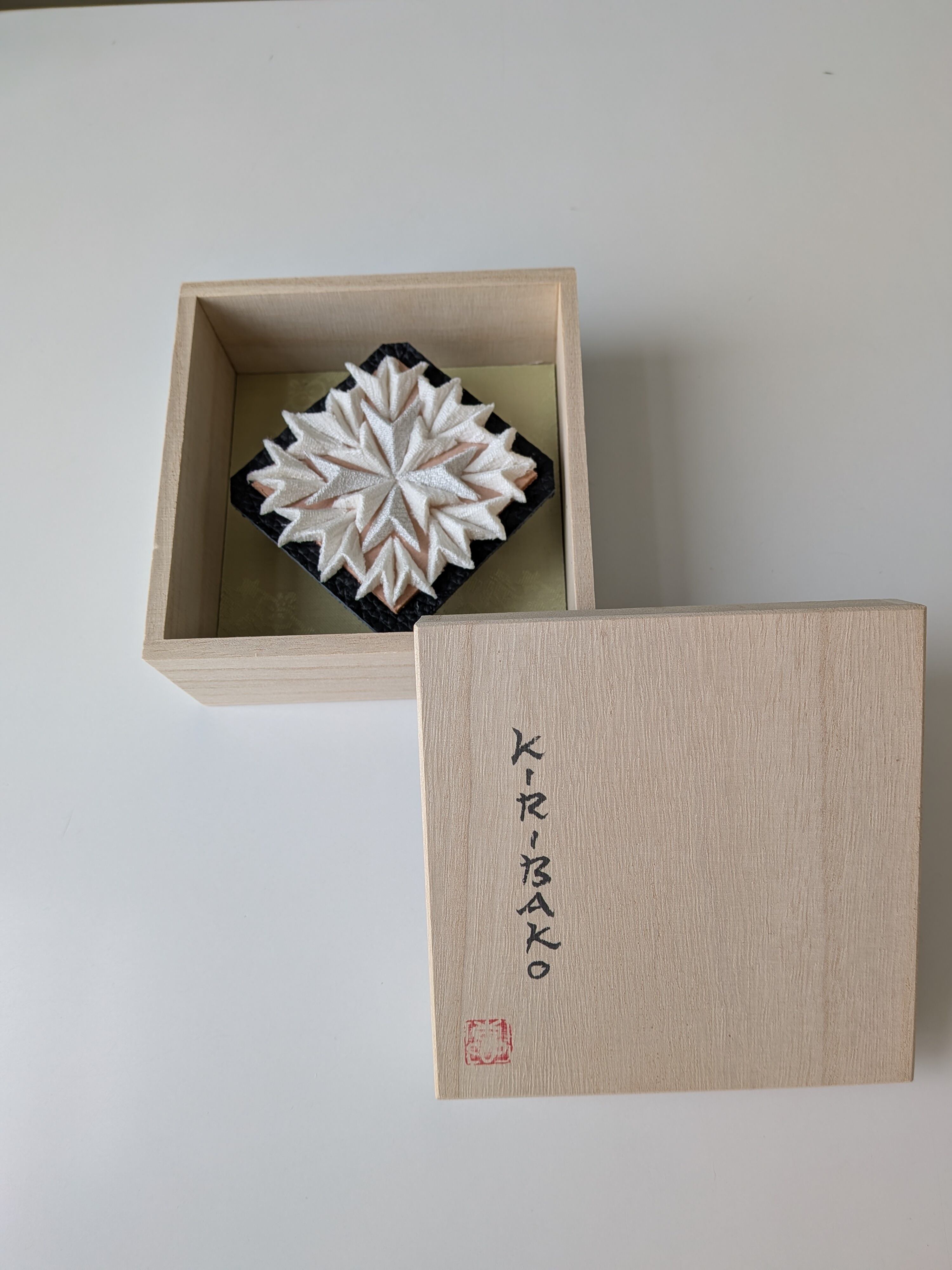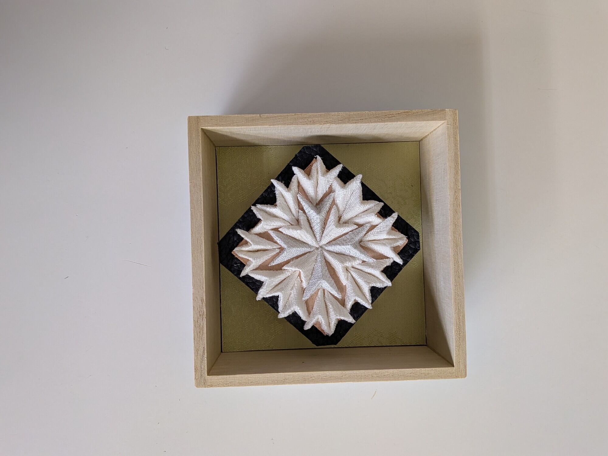 伝統技法で丹後ちりめんを使用し、桐の箱(KIRIBAKO)に入れた新しい形の壁掛け・置物。